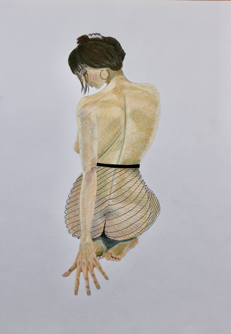 This drawing started as a life sketch of Julie, sitting down on the floor, which the artist then added a black fishnet skirt on top of.