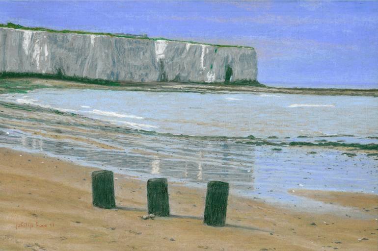 Reflections of the chalk cliffs on the wet sand