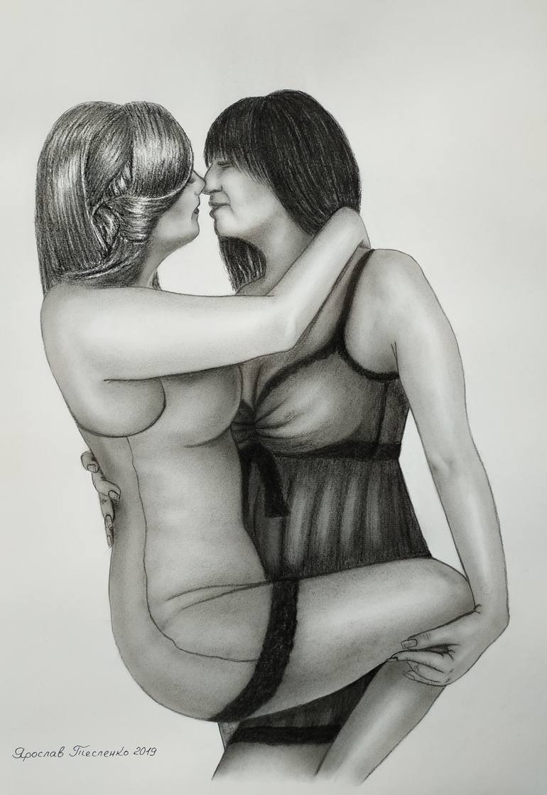 In my next picture I depicted two girls. The girl, the women - a mystery of nature, symbol of creation and harmony. Perfection and sensuality I find it in a woman. This charcoal work is no framed. A standard A2 (58.5x41.5 cm) frame would look great for this also. It's needs a frame.