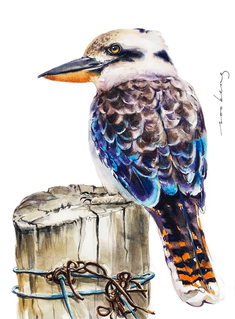 The Kookaburra is a larger member of the kingfisher family, instantly recognisable for both plumage and laughing call. Its intriguing raucous cackle is a familiar feature of the Australian dawn chorus. Watercolour on Saunders Waterford 300gsm smooth cotton paper.