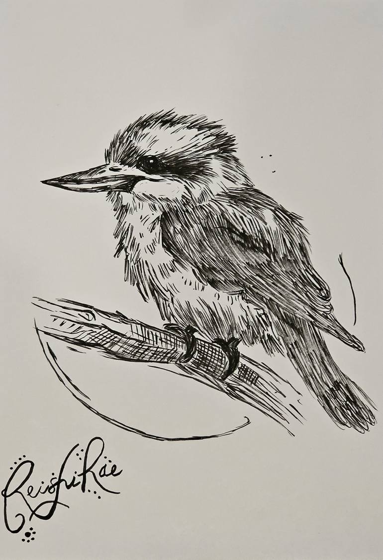 Title: "Kookaburra's Perch" Kookaburra's Perch captures the majestic presence of one of Australia's most beloved birds. This sketch features a kookaburra perched on a branch, its detailed feathers and sharp eyes rendered with intricate lines and shading. The simplicity of the black marker on white...