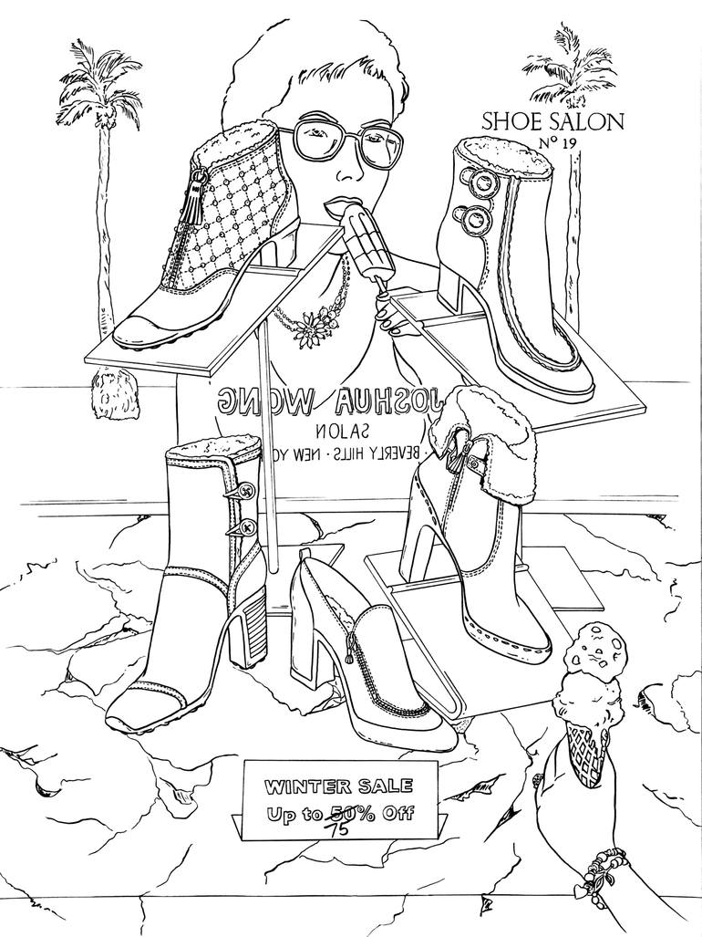 Boot shopping in LA? No wonder why they're on sale. The original artwork is 18" wide by 24" tall all hand drawn with a Japanese brush pen on white paper. Ready for you to frame and sent via a strong cardboard container. You will love this framed by itself or as a group. This original drawing i...
