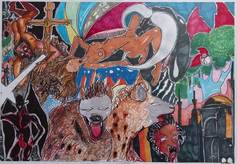 Questa vertiginosa illustrazione è stata ispirata dal Romanzo di G.Flaubert - Le tentazioni di Sant'Antonio - La scelta della sovrapposizione di più piani immaginativi senza continuità logica o spaziale trae la sua origine dalla traboccante furia di immagini che vengono fuori dal romanzo.