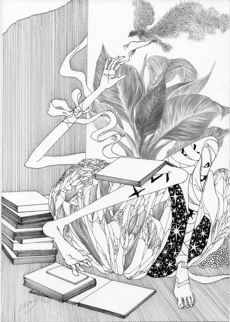 Choi Ji-ii ou l'art au bout des doigts -Commentaires de Antoine Coppola Choi Ji-ii (qui a illustré ces poèmes) est une artiste basée à Séoul. Son oeuvre picturale est multiforme et représente le meilleur de l'art contemporain coréen. Le dessin est une seconde nature pour elle. Sa méthode de travail est intuitive, c'est-à-dire qu'elle ne fait pas de plan ou n'anticipe pas le résultat de son travail. C'est en ce sens qu'elle retrouve la tradition de la peinture Zen asiatique, qui cultive la force du temps de l'acte de création aux dépens de la représentation, tout en forgeant des formes inspirées de l'art moderne occidental. Simplement et spontanément, les traits apparaissent sous ses crayons, se répandent sur la page, comme émergeant de ses souvenirs, de ses expériences passées, qu'elle reconnait parfois ensuite ou qu'elle ne reconnâit pas du tout. Des membres de sa famille surgissent en dessin, mais aussi des plantes ou des insectes au gré de son inspiration du moment. Choi Ji-ii a grandi dans les faubourgs d'une petite ville industrielle avec sa famille avant de migrer, comme la plupart des artistes coréens, vers la mégalopole qu'est Séoul. Elle y a fait ses études d'art tout en supportant la perte douloureuse d'une de ses soeurs ainées, morte après une longue maladie. Elle s'installe ensuite dans le quartier étudiant et artistique de Hongdae, dans le Nord-Ouest de la capitale coréene. Là, elle devient assistante d'un peintre local célèbre qui lui octroie l'usage de son immense atelier. Choi Ji-ii commence alors une oeuvre surdimensionnée avec des tableaux géants qu'elle a du mal à transporter ou à produire dans des expositions. Mais sa renommée grandie malgré tout, à l'ombre du mâitre pour qui elle se dévoue totalement alors que son style ultra-réaliste s'oppose à l'abstraction minimaliste de son patron. Car si Choi Ji-ii se laisse aller à dessins de pure fantaisie, ses grandes toiles sont des bijoux de vues ultra-réalistes de lieux souvent urbains: croisements routiers, cuisines aménagées, etc. le tout composé d'une foule de couleurs intenses, apposées dans le style pointilliste. Pour ses dessins souvent monochromes ou bicolores, Choi Ji-ii retrouve son bestiaire fantastique, des formes fragmentaires, comme des souvenirs incomplets. La recherche d'une certaine abstraction se manifeste alors, le style avant tout, le trait pour le trait, le point pour le point. Un seul but semble réunir la plupart de ses oeuvres: le dépaysement.