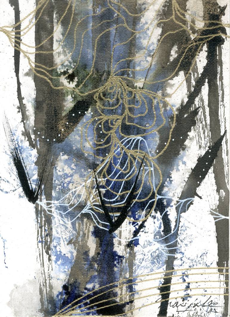The work of Marijah Bac Cam questions the Memory of the Living through the Languages of the Feminine Principle (creative principle of Nature) by means of drawing, painting and increasingly photography and video. What does this chaos of fullness and emptiness mean, enhanced with dots, curves, golden wefts and gestural writing? In the artist's painting we perceive a Living being organized before our eyes, starting with the diffusion of black ink. These dark masses mingle with another color to symbolize the different elements, air, water, fire, earth, ether. Suddenly an organic mesh forms on the surface, connected to the misty depth. It is a question of reversal, as if to lead our gaze towards an inner world, that of the organs, tissues, vessels of an unrepresented body. These drawings express more sensibly an intuitive word in a vegetal and vibratory atmosphere that are our buried memories. They are the representation of the original past in a form that is no longer mental but metaphorical. Graffiti sometimes float here and there, like a palimpsest as if to inscribe a forgotten verbal dimension and question the meaning of forms. Her work evokes images that are almost figurative but difficult to identify. It's a question of everyone's point of view, seen from the sky or underwater, in macro or even in a wide shot. This collective memory seems to define and tell terrestrial and extra-terrestrial landscapes. Does Nature have a universal language that hides in our memory?