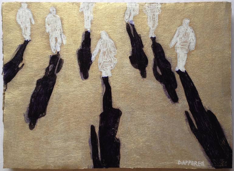 The artwork shows people standing and walking, they have long shadows. This artwork is made in mixed media, the techniques used are drawing and painting on cardboard. The ink used is white and classic inc blue. The background is a mixture of cardboard and subtle iridescent pearl gold. The drawing ...