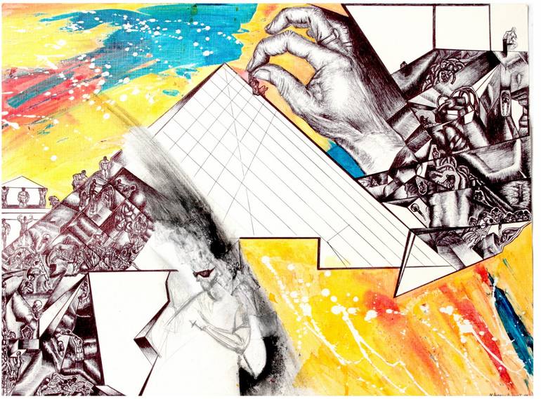 I was inspired by the pyramide of Louvre. I wish people see the Louvre differently.I show the consumer society, versatility of the human being. The little men it's us! I use the ink for its fluidity The style figurative ,contemporary art,illustration.