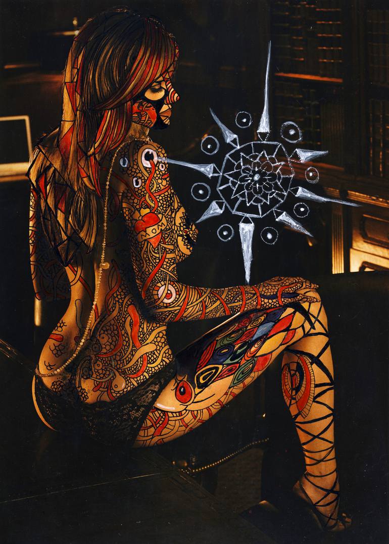 Ink on magazine page, part of "Psychoactive Bear", an ongoing psychedelic project of painted photographs and magazine pages: