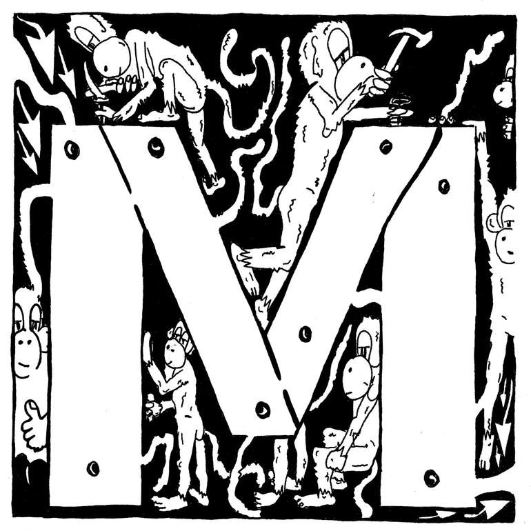Maze of the letter M being built by monkeys. Created by Yonatan Frimer. Maze entrance and maze exit is in the upper left and lower right corners. Solution for the maze can be found at