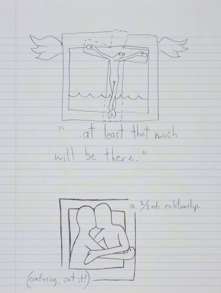 Everyone is their own favorite martyr. We pretend that not to be so, but it can’t be helped. How can we give what we don’t understand? We get maybe two thirds of the way there, but the rest, it’s all cotton candy and light show effects. Ink pen and highlighter on lined notebook paper. 2002. 11 ...