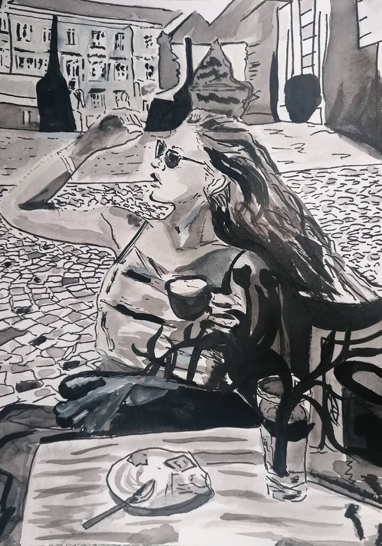 Title: Mediterranean breakfast Original artwork Ink on paper FABRIANO 250g/m² 21x29.7cm • 8"1/2x11"3/4 Category Painting > Ink painting Subject People and portraits Substrate Paper Materials Ink on Paper Style: Urban and Pop Dimensions 21 x 29.7 x 0.1 cm (unframed) / 21 x 29.7 cm (actual image siz...