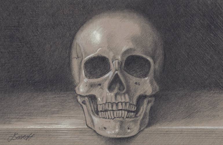 Memento Mori No.2, Graphite pencil with white chalk on Strathmore toned paper, 5.5 x 8.5 inches Learning the proportions of the head by understanding the anatomy of the skull. The two main parts of the skull, (Cranium) the skull and (Mandible) the lower jaw and chin. The round cap of the skull, (C...
