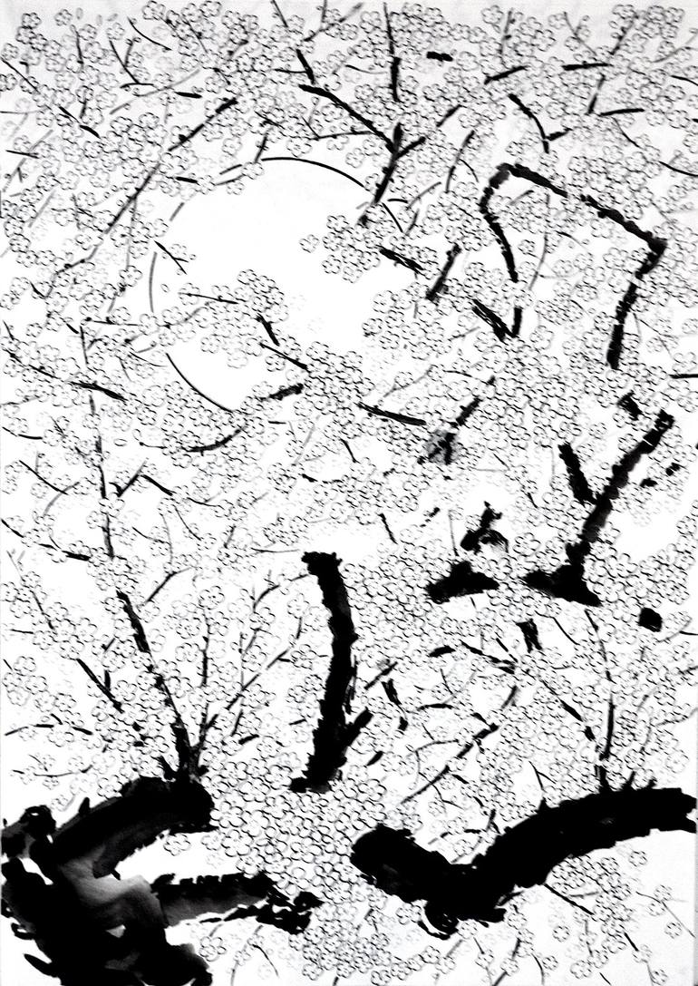 When coming closer to the tree, the flowers appear to be bigger. Viewers could see more details. The size of flowers varies to create impression size or age of trees. There are set of twelves works of each sub series in the moon light meditation. Twelves is a popular number, zodiac, religion, mont...