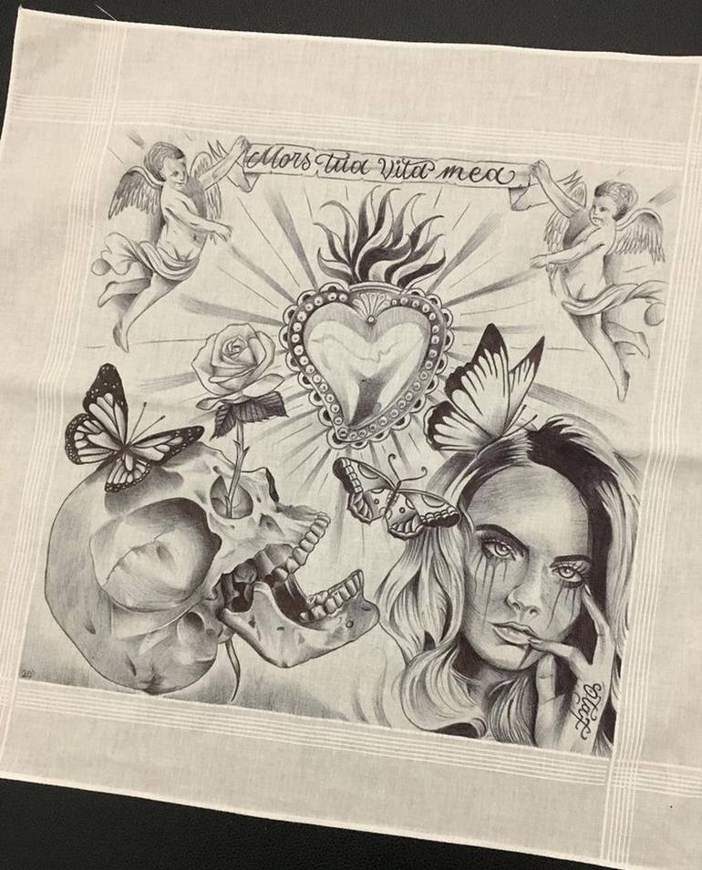 cloth handkerchief entirely drawn freehand with black ballpoint pen sacred heart central with a cry woman and skull with butterflies angels and calligraphy "Mors tua Vita mea"