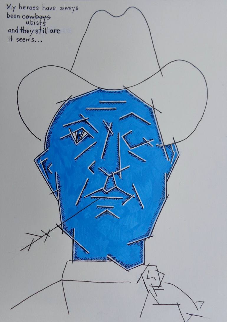 This drawing was inspired by a lyric that was taken from a Willie Nelson song "My Hero have always been cowboys" . In it I have drawn a cowboy's face in a Cubist manner and have changed the lyric (text) to " My hero's have always been Cubists" which holds more true to me.