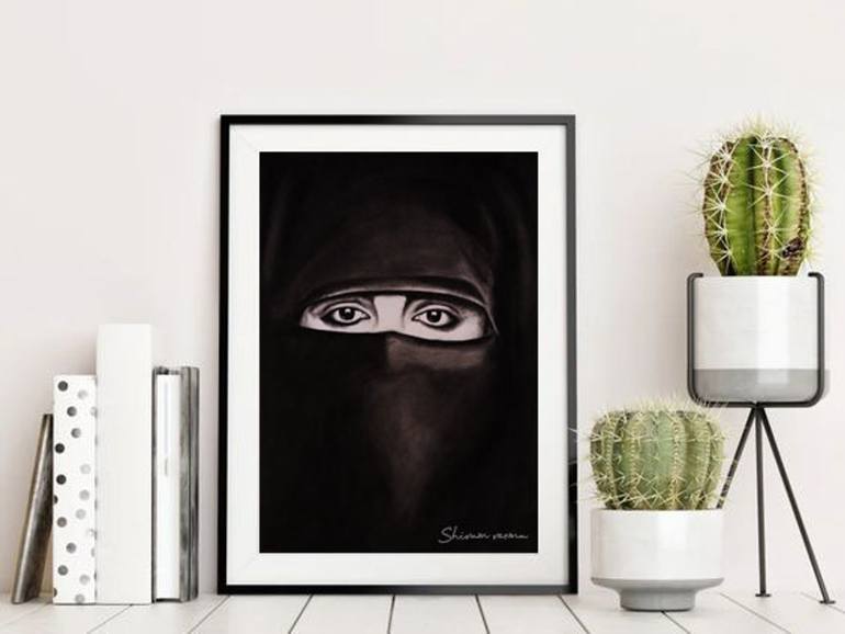 Niqab is a garment of clothing that covers the face, worn by Muslim women as a part of a particular interpretation of hijab (modest dress). In the Holy Qur'an it has been written for women that they should wear clothes after which their eyes, face, hands and feet. So I have created this artwork keep...