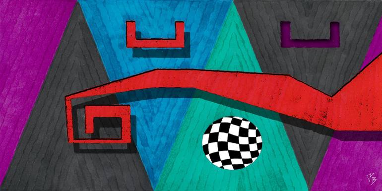 An abstract drawing of a red "arm" reaching for a black and white, checkered sphere. The background is made up of triangle blocks of color.