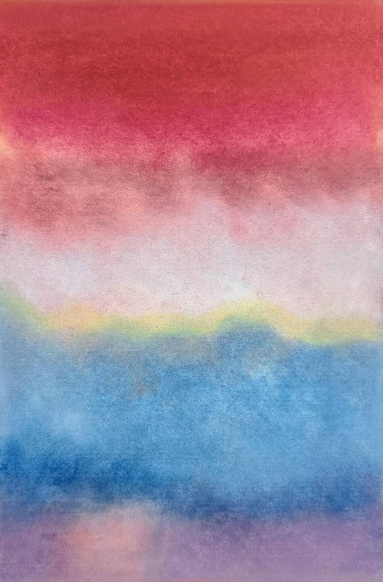 This pastel has great intensity. The colours and light vibrate. Yet it is softness that emanates from this gradation of red towards violet. The painting is signed below the drawing. The paper is sketch paper with a slightly crumpled appearance and torn edges. The pastel needs to be framed under gl...