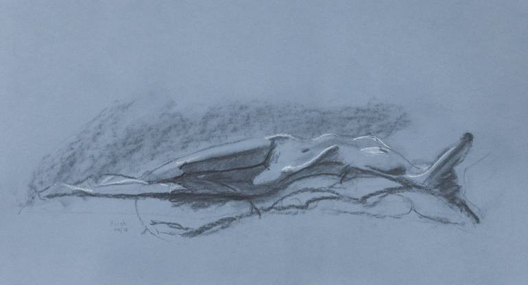 Charcoal and chalk drawing of dreamily reclining nude woman on archival, acid-free 100% cotton laid paper.