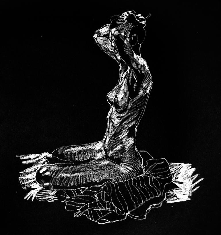 Life drawing sketch from the Washington Drawing Center class in the church attic at Dupont Circle. White Prismacolor pencil on Strathmore black paper. Twenty minutes.
