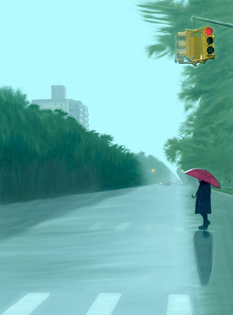 This image is drawn by hand on an iPad with an Apple Pencil and is beautifully printed with archival pigment ink on fine art paper. I will only make one print of this image. It depicts a woman with a red umbrella crossing Ocean Parkway on a quiet and rainy spring morning in Brooklyn, New York. A lar...