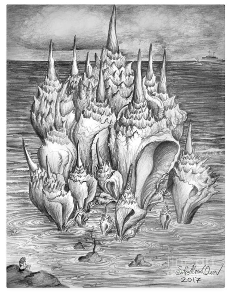 Pencil drawing on paper. Original. My fantasy. I saw those shells in my night dream, there was little cute magic... Light, sunshine, ocean, bright fantastic day and really-big shells. In that dream, I was a girl whom you can see on this pic, yeah, a small image/character that sits a stone, on left/...
