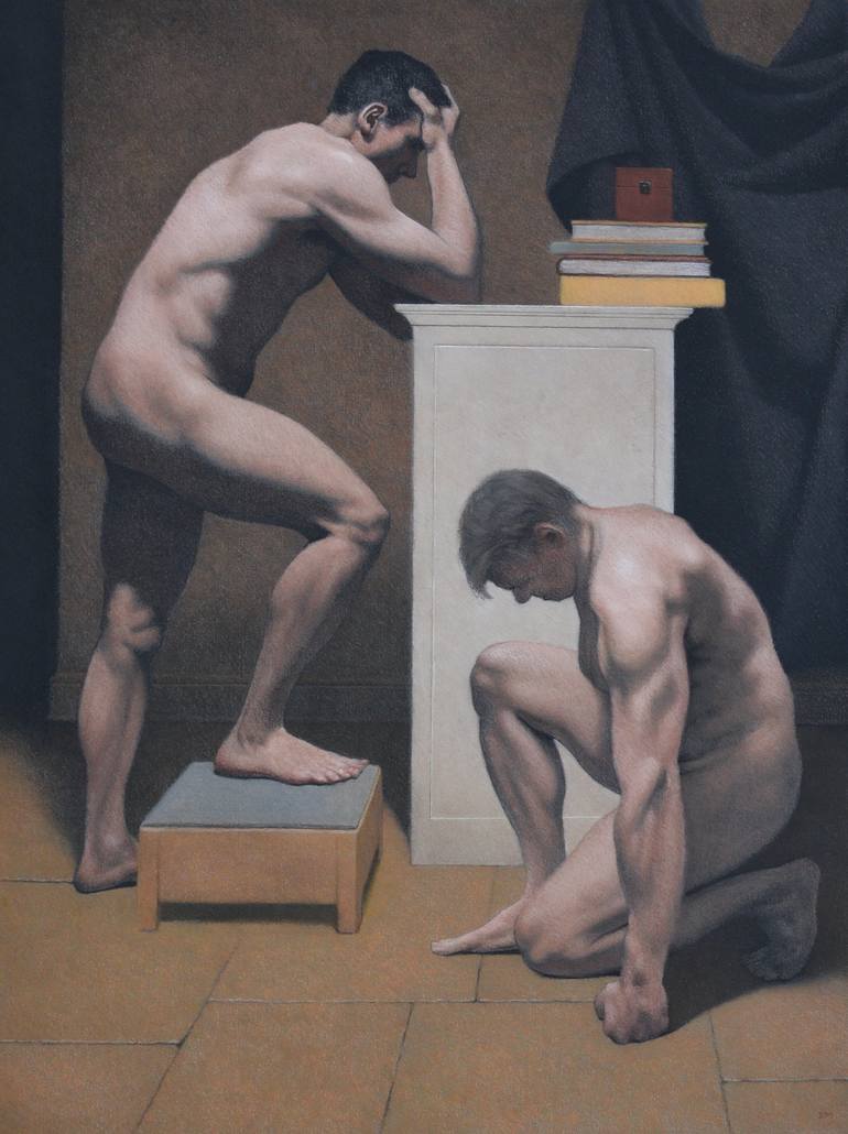 Two male nude figures in an interior, melancholic and introspective. Professionally matted and framed under glass.
