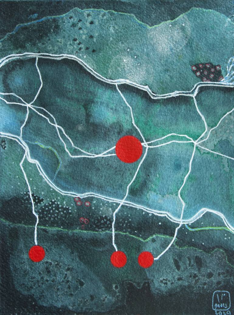 "Oekoumène #60" is a drawing made with ink and acrylic. A landscape ? Yes it may be... It belongs to series of drawings named "Oekoumène" (Some areas area of the earth planet inhabited by humans). Red dot depicts a sign of life in my drawings. This artwork on canvas is made with ink and painting. ...