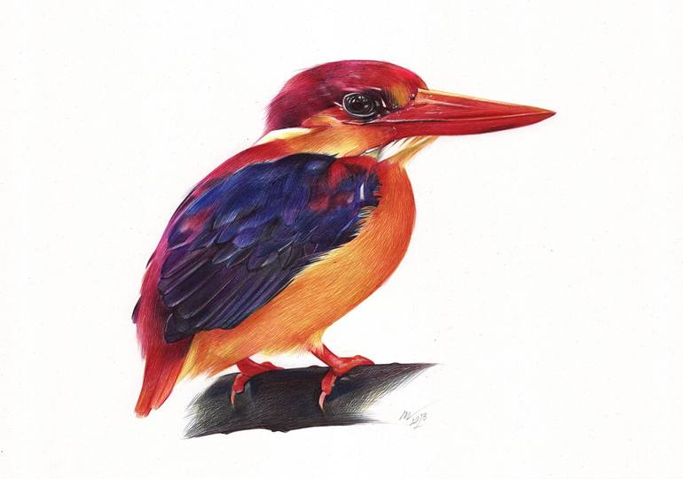 Drawing of a oriental dwarf kingfisher also known as the black-backed kingfisher or three-toed kingfisher (lat. Ceyx erithaca). It is a pocket-sized bird in the family Alcedinidae. This tropical kingfisher is a partial migrant that is endemic across much of the Indian Subcontinent and Southeast Asia...