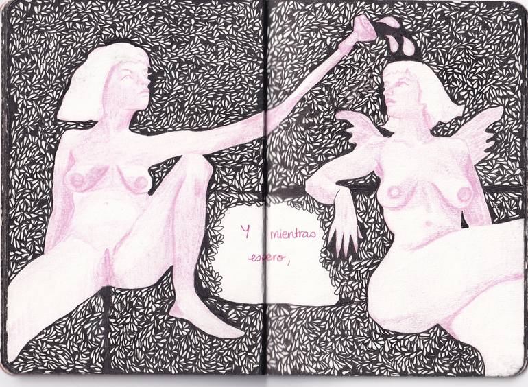 This was part of a illustrated poem, the original sketchbook its not for sale, but the reproduction of this poem is limited and done on a high quality paper, also using the finest printing system to reproduce the original artwork. The image says "While I wait", phrase part of the poem. It is a se...