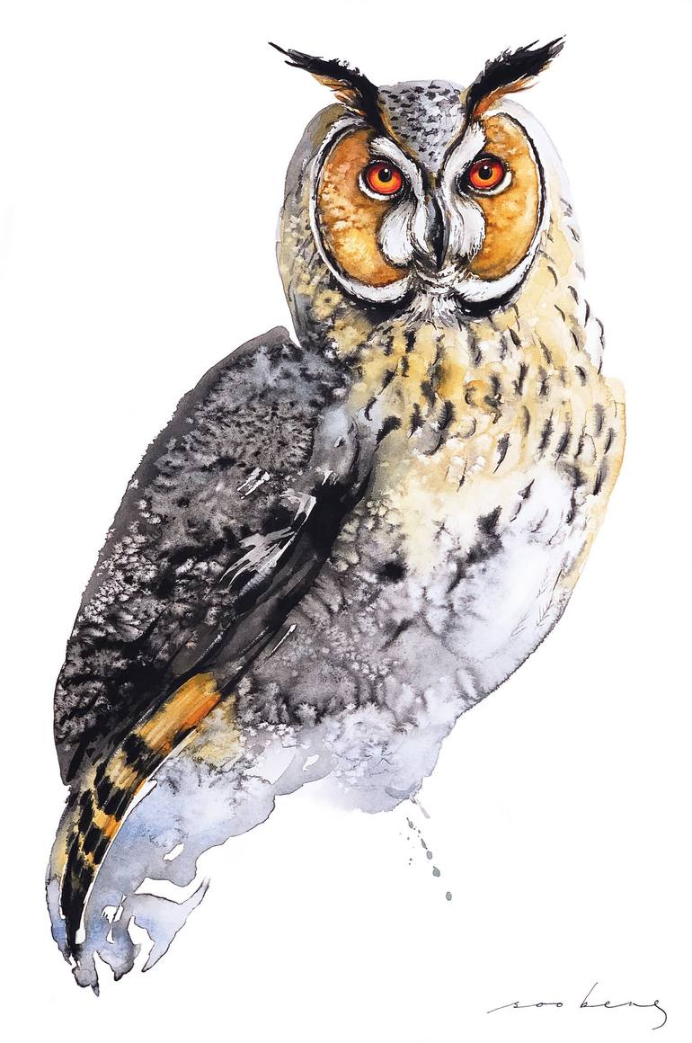 The owl’s expression is a blend of wisdom and mystery, its round eyes locked in a deep, almost hypnotic stare. In the stillness of the drawing, it feels as though the owl is silently judging the world with the quiet authority of nature’s oldest observer. Ink and watercolour on Saunders Waterford 300...