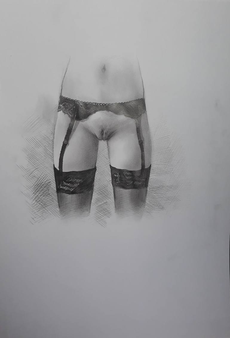Erotic sketch in pencil on papper. ( Woman in black stockings with garter )