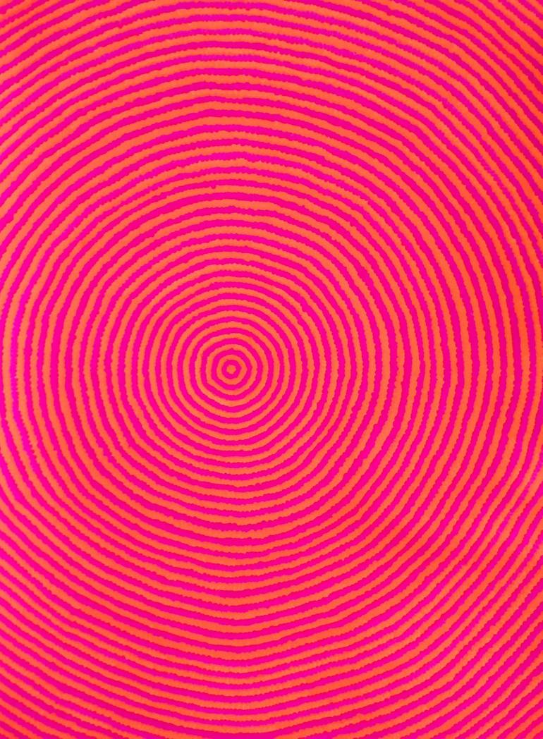 The artist was born in Nicosia, Cyprus (October 1987), where she currently lives and works. She holds a DNAP, (Diplôme National d’Arts Plastiques), from the Ecole Supérieure des Beaux-arts de Nîmes, as well as a DNAP and a DNSAP, (Diplôme National Supérieur d’Arts Plastiques), from the Ecole Nationale Supérieure des Beaux-arts de Paris, France, obtained with Distinction. Eleni Pratsi produces artworks with geometric compositions and explosive, liquescent colours. She utilises both painting and printmaking techniques, evoking a balance between creative control and affirmation of chance, which extends throughout all the works. Every composition is created from experimentation with different colour combinations and the infinite possibilities that surface through the repetition, overlap and juxtaposition of circles. The use of stencil, a meticulously cut-out original which meets the canvas, creates sometimes sealed, and other times porous boundaries for the vivid colours that are poured directly on it. The colour palette is influenced by pop culture, developments in pigments and industrial paint production, which Pratsi continually researches. The paint, whose density is specific but different every time, interacts within the in-between space of canvas and stencil in ways that are often surprising. The specifics of gravity, which carries the paint on the painterly surface, play an important part in the creation of colour drips and blocks. Having developed a special relationship to the materiality of painting and the multiplicity of printmaking, Pratsi proposes images that do not impose a fixed meaning but invite the eye to travel within otherworldly landscapes, seen as if from above. The visual and emotional connections one can make, lead to different interpretations of the works. The title of the exhibition, “La Vie en Ronde”, can be interpreted to refer to the “roundness” of life, that feeling of things being mysteriously tied to each other, turning on their own accord, flowing, mixing, and mingling on endless horizons. Evagoras Vanezis Art Theorist