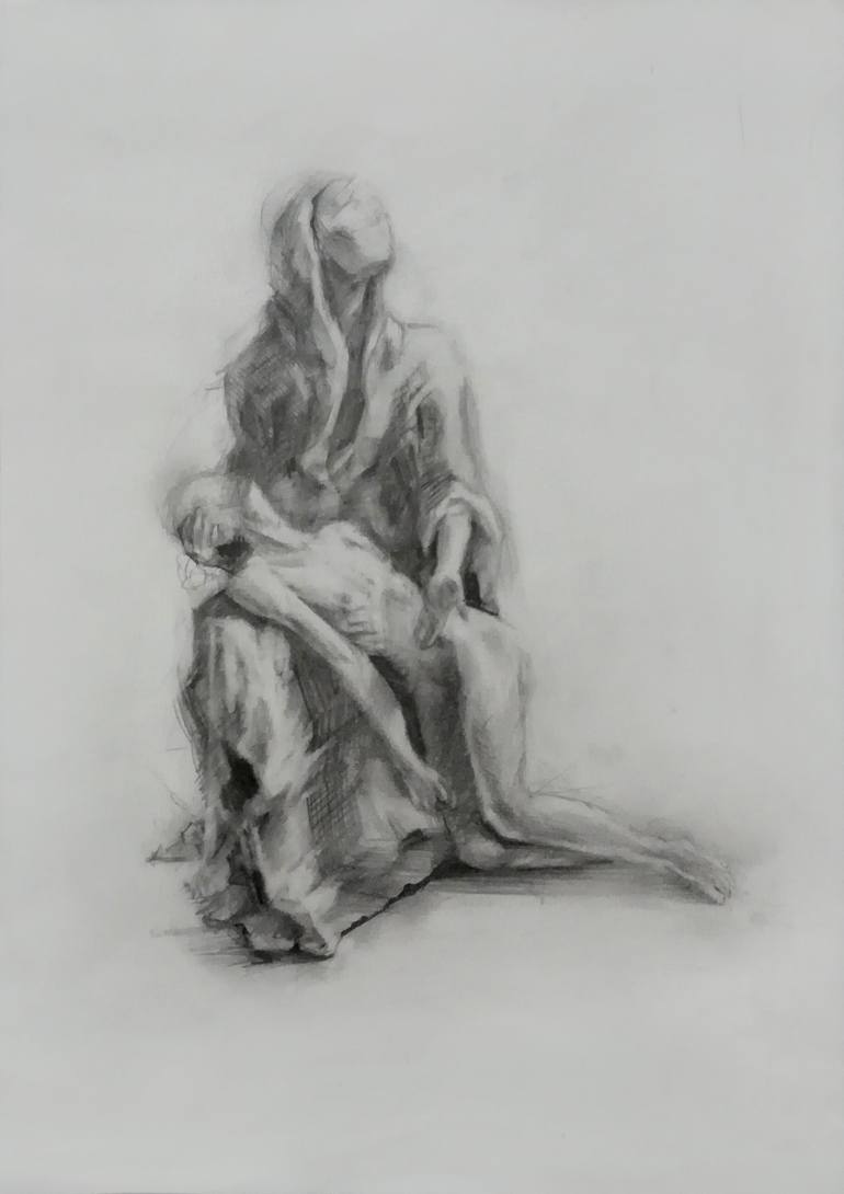 Madonna with Christ. Inspired by Michelangelo`s Pieta . Made with simple pencil on a thick paper .