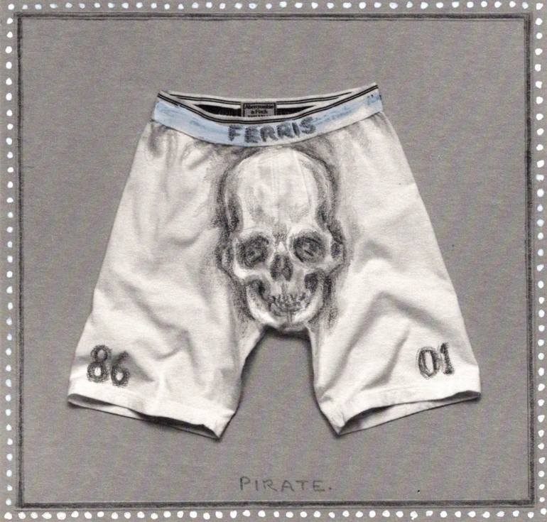A subverted advert really: taken from a packet of boxers, modified with pencil. The connection between the little death and the greater might be a reaction to the end of love, or conceivably a comment on AIDS, made subconsciously.