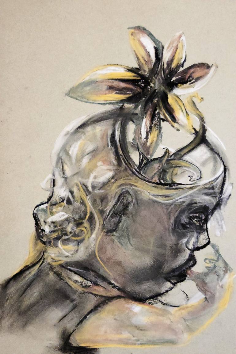 Porcelain Girl With Flower head looks to be pondering life's mysteries such as is my ghost arm trying to tell me something, and how does something as wondrous as a flower come to be from nothing more than a seed, dirt, water and sunlight? This piece was drawn with charcoal and oil pastels on a 12x18...