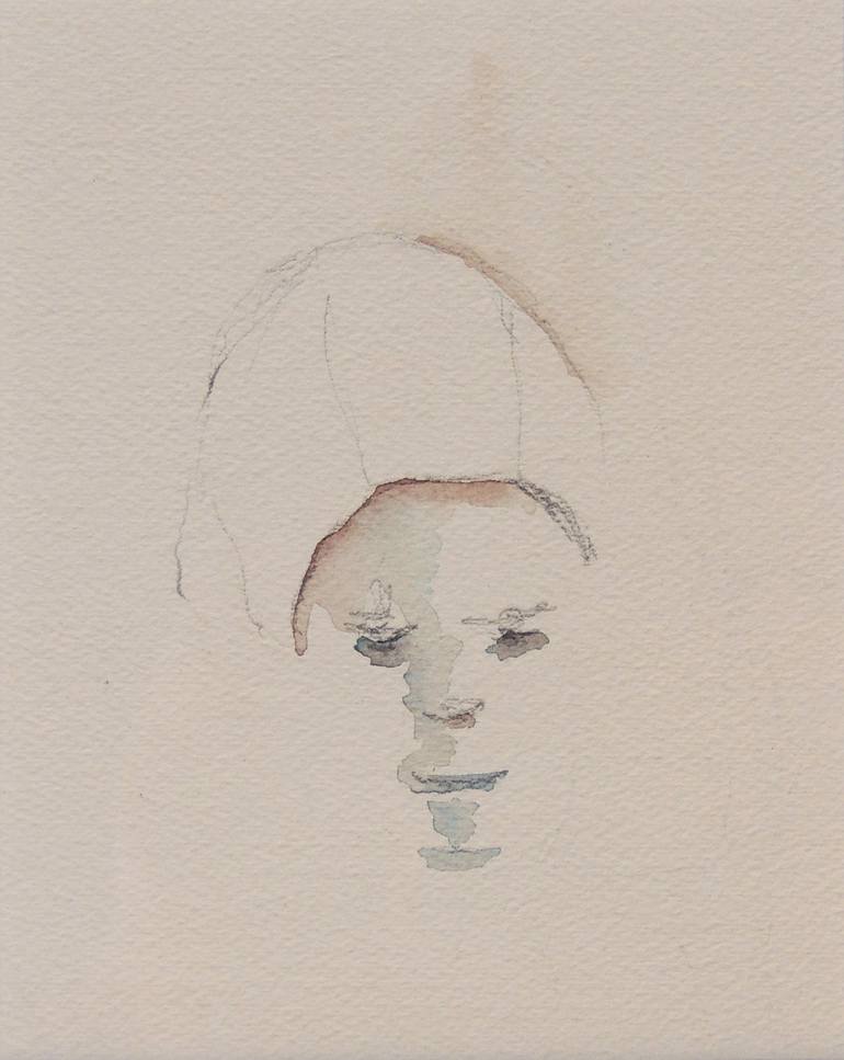 A delicate pencil drawing with accents of pale green-grey and brown watercolour wash around the facial features. The portrait sits in the centre of the page in an off-white background. The frame is gun-metal grey. Ready to hang. Very attractive.