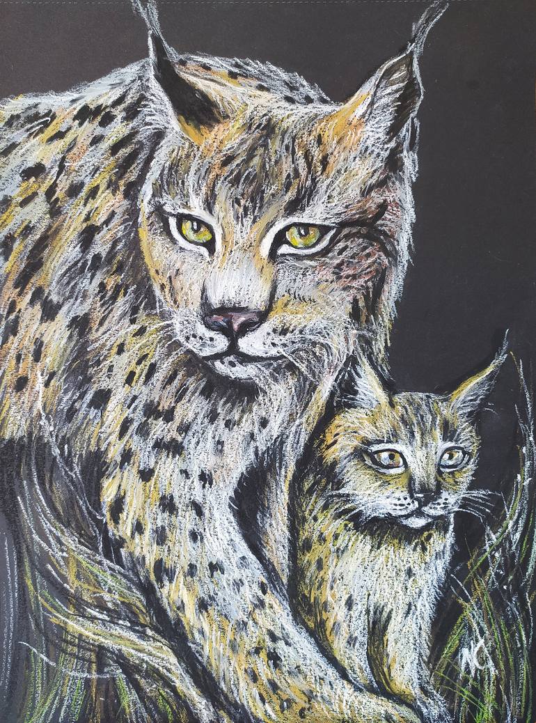 "Portrait of a lynx and cub" - paper, oil pastel. Original oil pastel work. Author Kokorina Nadezhda. The picture can be given to animal lynx lovers! I will make a portrait of your favorite animal to order for you! I have two cats at home, and I love them very much! They inspire me to be creative! ...