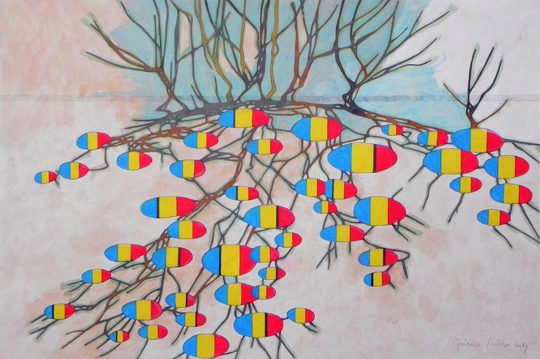 An original piece from the series "Withered trees", oil and pencil on paper. 48 x 32 cm. The structure of a tree is simple and curious: some ramifications in the air to catch the light, some branching underground to pick up the food. But branches and roots are similar: both are developed linearly, ...