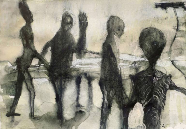 It was a nightdream or a vision in a fever. As if a procession was walking in a fog. People walked in silence, but they walked very strangely, like puppets controlled by an inept hand. At some point, it became clear that they were carrying something. What was it? The sketch is drawn on paper and n...