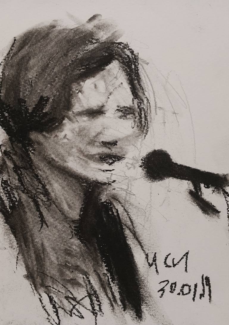 I was at a club where a duo of a female singer and an acoustic guitar where having their R'n'B show. They were really astonishing. I made a drawing of the lady singer.