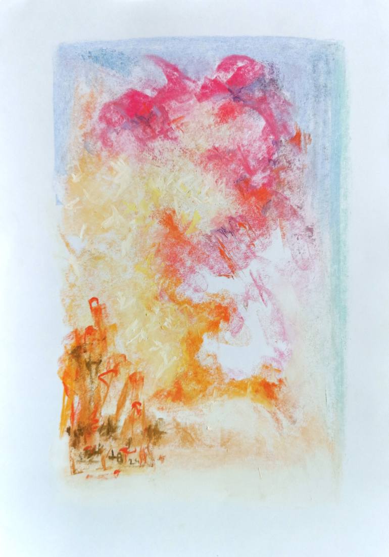 "Radiant Flux" is an evocative abstract drawing created with soft pastel on paper. The piece features a vibrant explosion of warm hues, with reds, pinks, and oranges blending seamlessly into lighter, airy tones. The dynamic application of pastels creates a sense of energy and movement, inviting view...