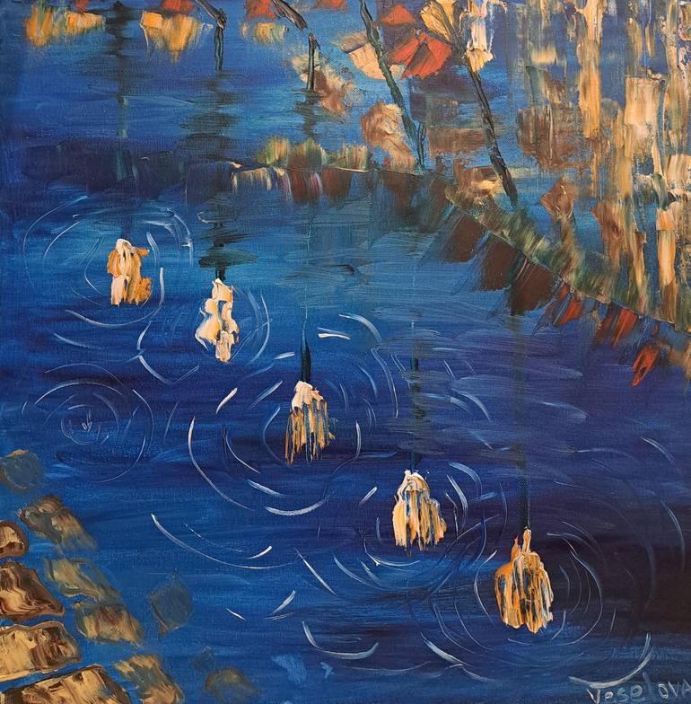 Experience the mesmerizing scene of lanterns dancing on water with "Rain Lanterns." This stunning painting captures the reflections of light in the rain, as blue hues and abstract lines create a captivating and dreamy atmosphere. The canvas is alive with a mix of bold and soft brush strokes, creati...