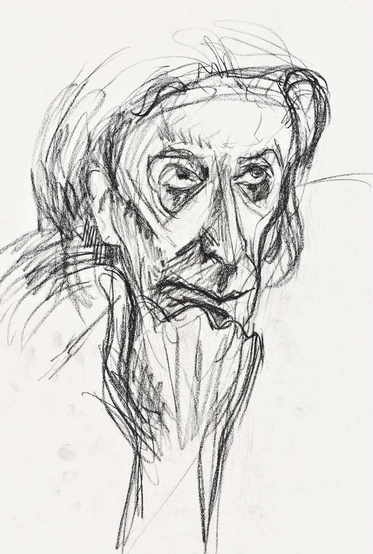 This expressive conte line drawing captures model Robert’s face turned upward, emphasizing the dynamic connection between head and hand. His subtly whimsical expression adds a playful yet introspective quality, highlighting the artist’s skill in balancing anatomical precision with expressive nuance....