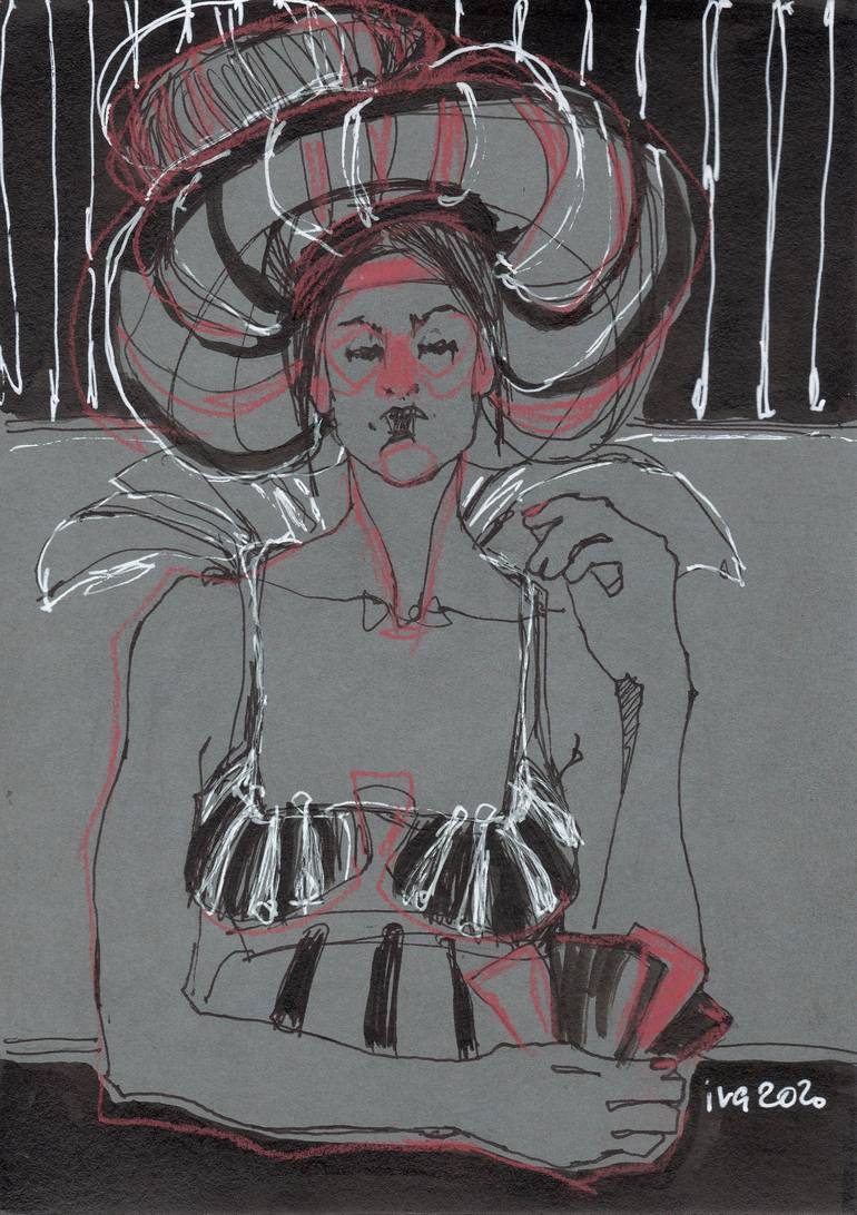Black and white ink and colored pencil on grey paper 250 g/cm2, 2020. Framed, black, 32x23x2 cm.