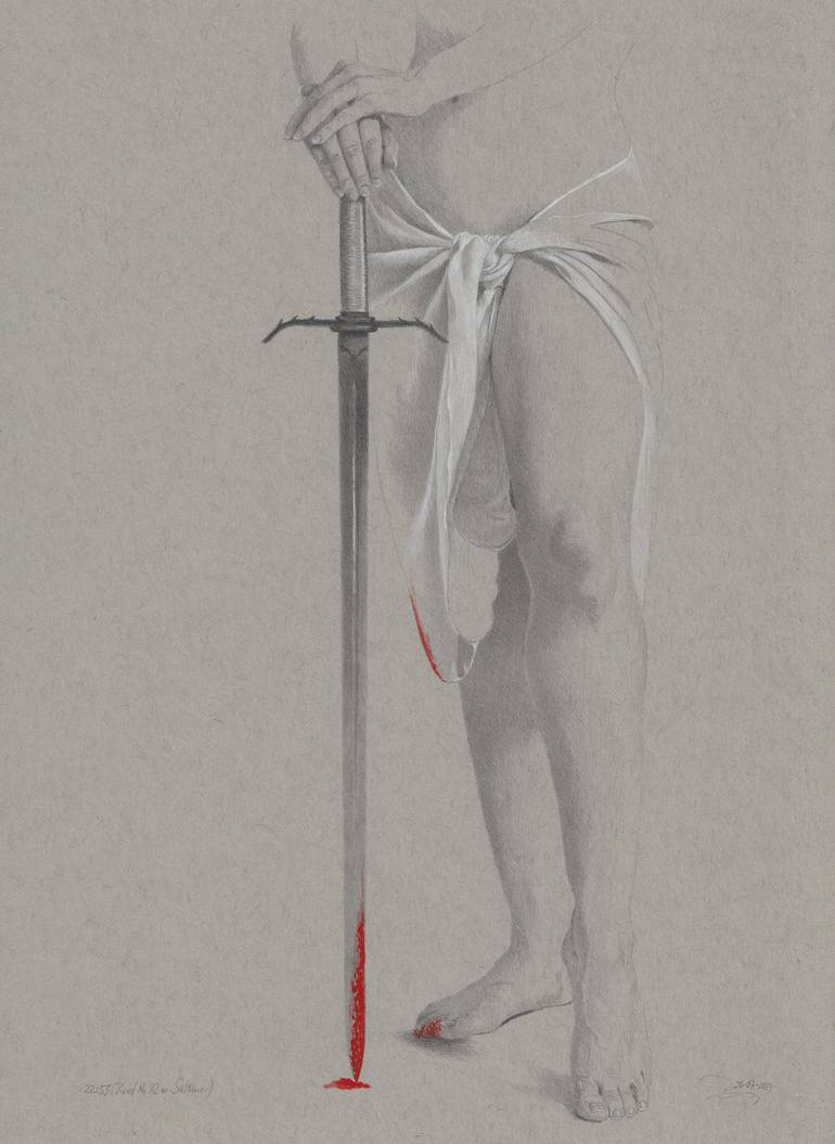 Number 12 of my "Rred" series. Hardly a nude drawing this time. Based on the legend. What fascinates me is the symbol of female cruelty paired with female beauty. :-) Drawing is on grey toned Strathmore cardboard.