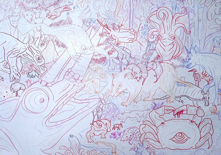 LÍNEA DE TRABAJO ACTUAL: Objetivo: Mis trabajos intentan mediar entre los recuerdos, alusiones y menciones a la vida salvaje en combinación con mi niñez y la remembranza que tuve de ella durante mis primeros años de conciencia, donde invente esa tierra imaginaria que funciona como un refugio personal en el cual conviven todas mis influencias: la ciencia ficción, los dibujos animados de los años 80s-90s, sus camadas inagotables de muñequitos, la ilustración científica, los video-games 90´s, el cine clase B, y claro, una figura central y protagonista: la Fauna. La infancia y la fauna o la fauna y la infancia. Es casi un cliché que a los niños les gusten los animales: curiosidad, gusto y porqué no fascinación. Pero ¿qué ocurre cuando se traspasan los márgenes de esta relación?... Existe un mundo interno (llamado Ocampa), al que suelo viajar, donde esto ocurre desde que soy un infante y mis únicos amigos eran los animales con sus imágenes… Por ende mi conexión con estas imágenes se dio desde muy chico. Al principio era admiración y deslumbramiento por sus formas, sus rasgos y figuras. Tenían algo que me fascinaba desde su diseño. En esa época me resultaba más fácil comunicarme e identificarme con los animales que con las personas (por la dislexia que tenía entonces); eso motivó una relación en la cual siento que puedo percibir cosas muy profundas de ellos. Quien alguna vez se haya tomado un rato para apreciar la apariencia que tiene la fauna, enseguida descubre que hay algo más detrás de ella, algo que de niño me parecía NO ser de este mundo, y por eso la admiraba. Eso me trasportaba a esta tierra imaginaria en donde podía estar con las mas caprichosas y exóticas criaturas. Sabía que había algo más de lo que se nos mostraba, y esas especulaciones, fantasías y aventuras me dieron un imaginario tan sobrecargado como especial, para mí. Fue así que, con el paso de los años llegué a sentirme en deuda con los animales, por todo lo que me dieron, tanto en la infancia como posteriormente.