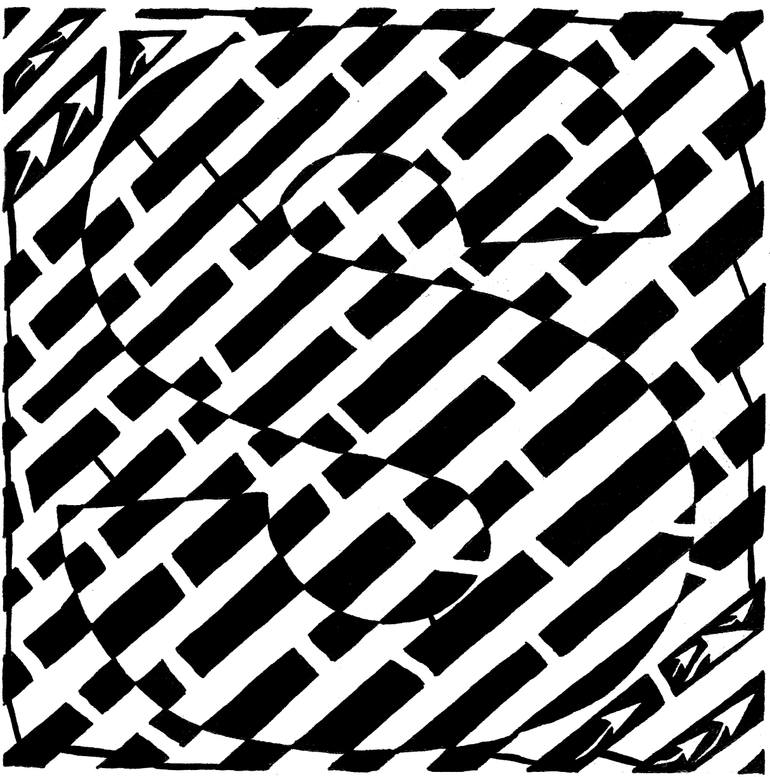 Maze of the letter S. Entrance of the maze is in the upper left corner and exit of the maze is in the lower right, marked by arrows. Created by Yonatan Frimer. Maze solution can be found at