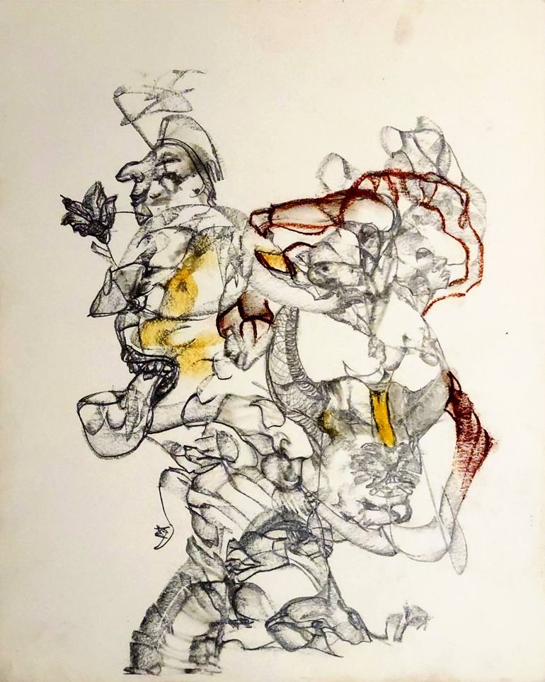 Sailors, Three Faced Demons And So Forth is a plume of characters springing forth from the thin air. Where did they come from? Where are they going? Perhaps these questions can be answered by staring deep into the drawing while simultaneously contemplating quantum physics. Most likely not.