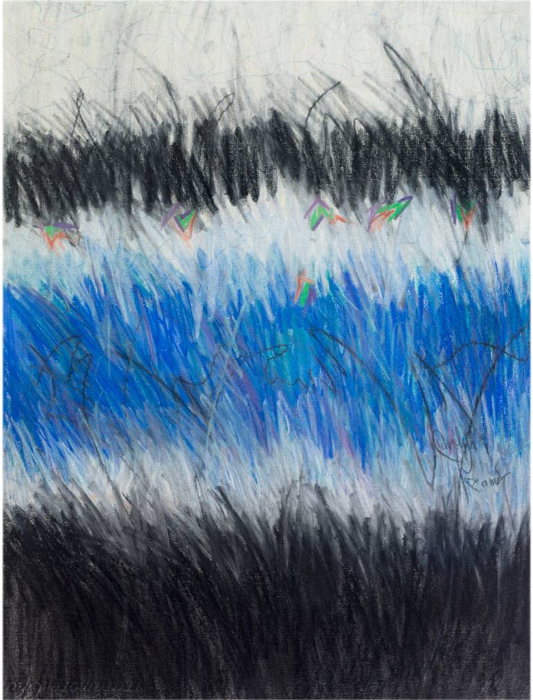 Horizontal lines of the sea inform this pastel paper work. The ocean is captured in colbalt & sapphire chalk pastel woven along with rich blacks, whites and shots of bright orange which occur throughout the art work. Bold gestural scribbles capture the energy of blowing wind and water. The viewer wi...